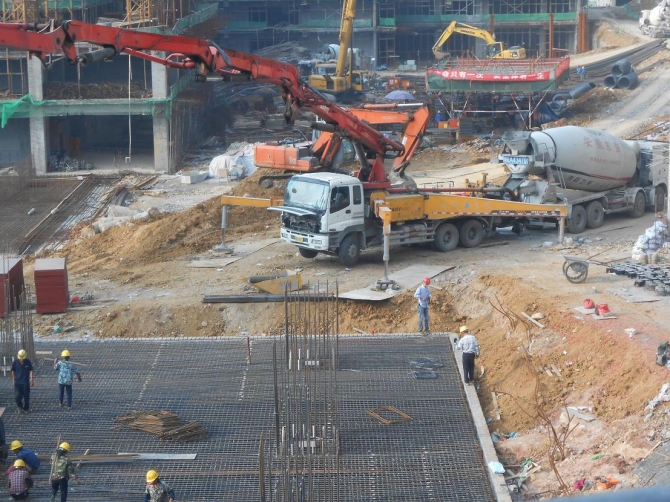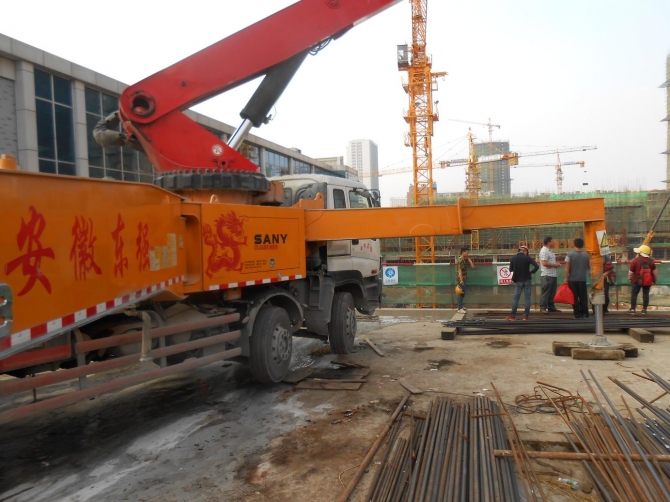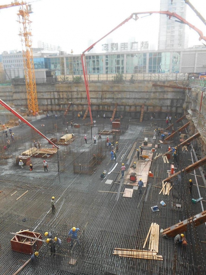 寶利豐廣場(chǎng)項(xiàng)目樓位于徽州大道與靶場(chǎng)路交口,其中1#樓采用樁筏基礎(chǔ),其中核心筒區(qū)域筏板厚度為7-8m,其他區(qū)域厚度為3.2m,混凝土強(qiáng)度等級(jí)為C40P8,一次性連續(xù)澆筑。施工現(xiàn)場(chǎng)布置56m汽車(chē)泵一臺(tái),46m汽車(chē)泵兩臺(tái),地泵一臺(tái),截止2015年09月27日用時(shí)約40小時(shí),8600立方混凝土全部澆筑完畢。