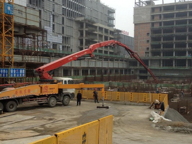 合肥綠地中央廣場位于高鐵路與廬州大道交口,高鐵南站旁。該項目由合肥建工集團承建,其中塔樓D建筑高度為200m,底板砼強度為C45P8,12000立方砼一次性連續(xù)澆筑,我公司48小時完成該項目12000方砼連續(xù)澆筑。該部位砼難點在于水化熱的控制,因為設(shè)計強度高(C45),底板核心筒位置厚度達(dá)9m。經(jīng)過我公司技術(shù)團隊的精心設(shè)計,優(yōu)化配合比,采用優(yōu)質(zhì)粉煤灰.礦渣粉雙摻,降低水泥用量等技術(shù)措施,該項目底板沒有出現(xiàn)裂縫。經(jīng)過長達(dá)15天的溫度監(jiān)測,砼中心溫升未超過60攝氏度,溫差未超過25攝氏度,該部位施工完美結(jié)束。