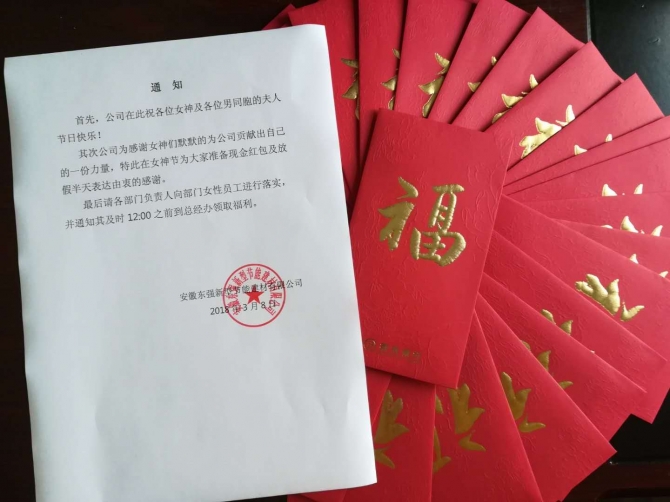 公司為感謝女神們默默的為公司貢獻(xiàn)出自己的一份力量,特此在女神節(jié)為大家準(zhǔn)備現(xiàn)金紅包及放假半天表達(dá)由衷的感謝。